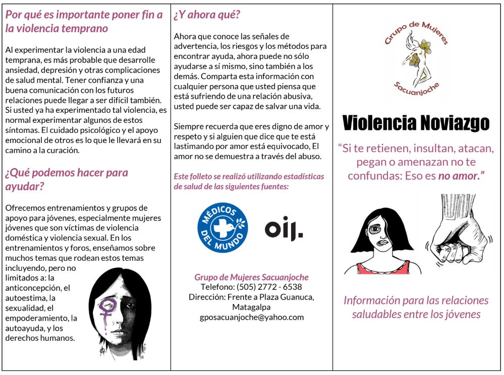This is one of two projects that I completed for my internship at Grupo de Mujeres Sacuanjoche, a women’s nonprofit in Matagalpa, Nicaragua. Without any foundation to start with besides example brochures and learning materials from my workplace, I began doing research on the prevalence of dating violence in Nicaragua, how it’s defined, and what the recommended process for leaving an abusive relationship safely. By doing this research on the internet and through the materials from my organization, I gained a better understanding of how to organize the brochure. I not only learned about the news headlines and statistics of dating violence in Latin America, I feel that I learned a critical skill that is necessary when working with an educational organization – how to effectively communicate information in a way that interesting and easy to digest. GMS can’t travel everywhere in Nicaragua to teach on these issues of gender violence, but through the use of brochures, information can be spread anywhere and everywhere. — Leigh-Anna Nielsen